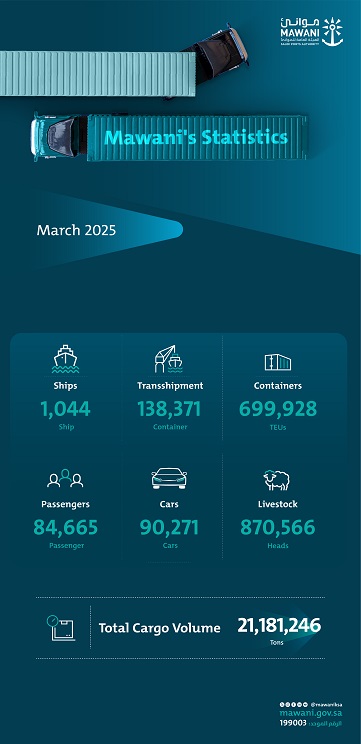 RIYADH, Saudi Arabia, April 10, 2025: The ports supervised by the Saudi Ports Authority (Mawani) recorded a 13.61% increase in container handling during March 2025, reaching 699,928 TEUs compared to 616,079 TEUs in the same period last year. Exported containers saw a significant rise of 31.82%, totaling 280,341 TEUs compared to 212,672 TEUs in the same period last year, while imported containers grew by 7.78%, reaching 281,216 TEUs compared to 260,912 TEUs. However, transshipment containers recorded a 2.89% decline, totaling 138,371 TEUs compared to 142,495 TEUs in the same period last year.