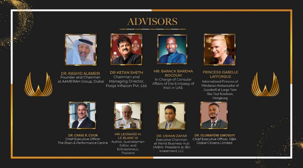 We sincerely thank Dr. Rashid Alameri, Founderand Chairman of AAMERAH Group, Dubai; Princess Isabelle Lafforgue, Hong Kong; Dr. Usman Zafar, Executive Chairman of World Business Hub and President of IBU Investments LLC; Dr. Ketan Sheth, Chairman and Managing Director of Pooja Infracon Pvt. Ltd, India; Mr. Barack Barema Bocoum, In Charge of Consular Affairs at the Embassy of Mali in UAE; Dr. Craig R. Cook, Chief Executive Officer of The Brain & Performance Centre, A DP World Company, UAE; Dr. Oluwafemi Omosuyi ,Chief Executive Officer ofOBA Global Citizens Limited, Africa; and Mr. Leonard H. Le Blanc III, Author, Businessman, Editor, and Entrepreneur based in Thailand. We deeply appreciate their dedication and leadership which continue to inspire excellence within the Prime Awards community.