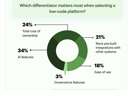 Cost efficiency remains a critical metric for success, with 57% of CIOs measuring the impact of low-code platforms by reduced application development costs, followed by reduced maintenance costs and the number of new applications deployed. When selecting platforms, AI features ranked as the most important differentiator (34%), ahead of total cost of ownership and system integration capabilities, signalling that AI-driven development is becoming a top priority for technology leaders.