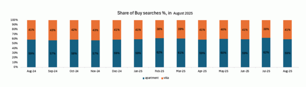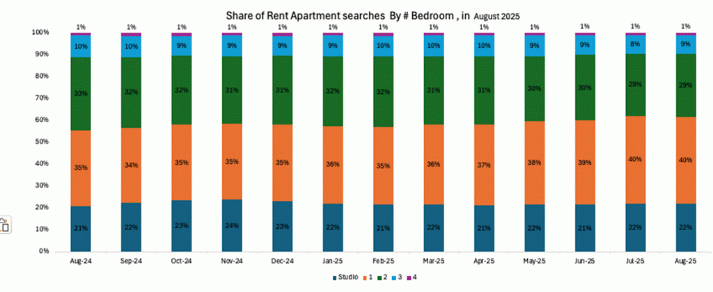 - Apartments remained the top choice (80% of rental searches, 59% of buyer demand), with smaller units – studios and one-bedrooms – gaining traction