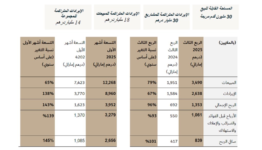 وبلغ إجمالي الإيرادات المتراكمة للشركة نحو 14 مليار درهمحتى تاريخ 30 سبتمبر 2025، مدعوماً بالمبيعات المسبقة المستمرة والطلب القوي من المشترين المحليين والدوليين.